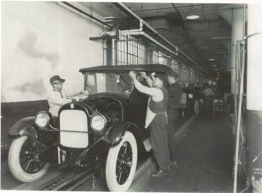 Durant Motors Inc. Lansing, Michigan Plant assembly line. Here a 1923 Durant A-22 Touring Car comes down the assembly line with employees putting the final touches on the top. Note the white rubber tires on the vehicle.