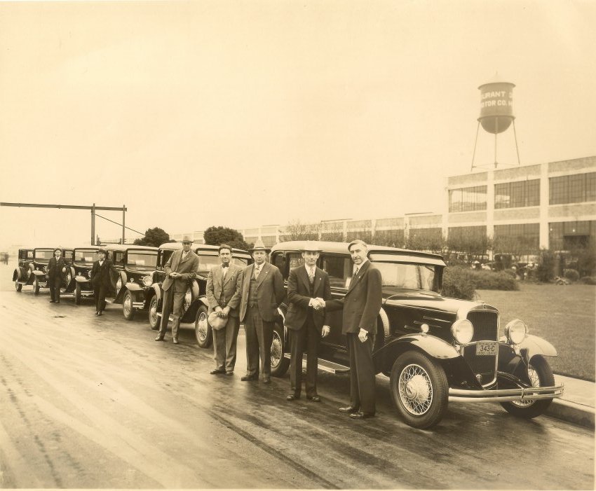The first drive-away of the new 1930 Durant Model 614 series from the Durant Plant in Oakland, California. L.G. Peterson of the Peterson Motor Company of Boise, Idaho is congratulated by Durant Motors California President Norman DeVaux as he takes delivery of five 1930 Durant Model 614 Series Deluxe Sedans to be driven back to his territorial dealership prior to the announcement of the new cars. Norman DeVaux is to the right, L.G. Peterson is in front of the passenger door.