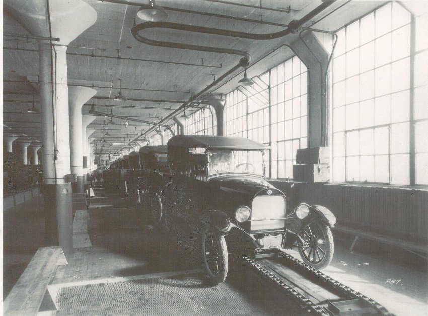 Durant Motors Inc. Lansing, Michigan Plant, assembly line. 1923 Star touring car coming down the assembly line ready to head to the shipping department.