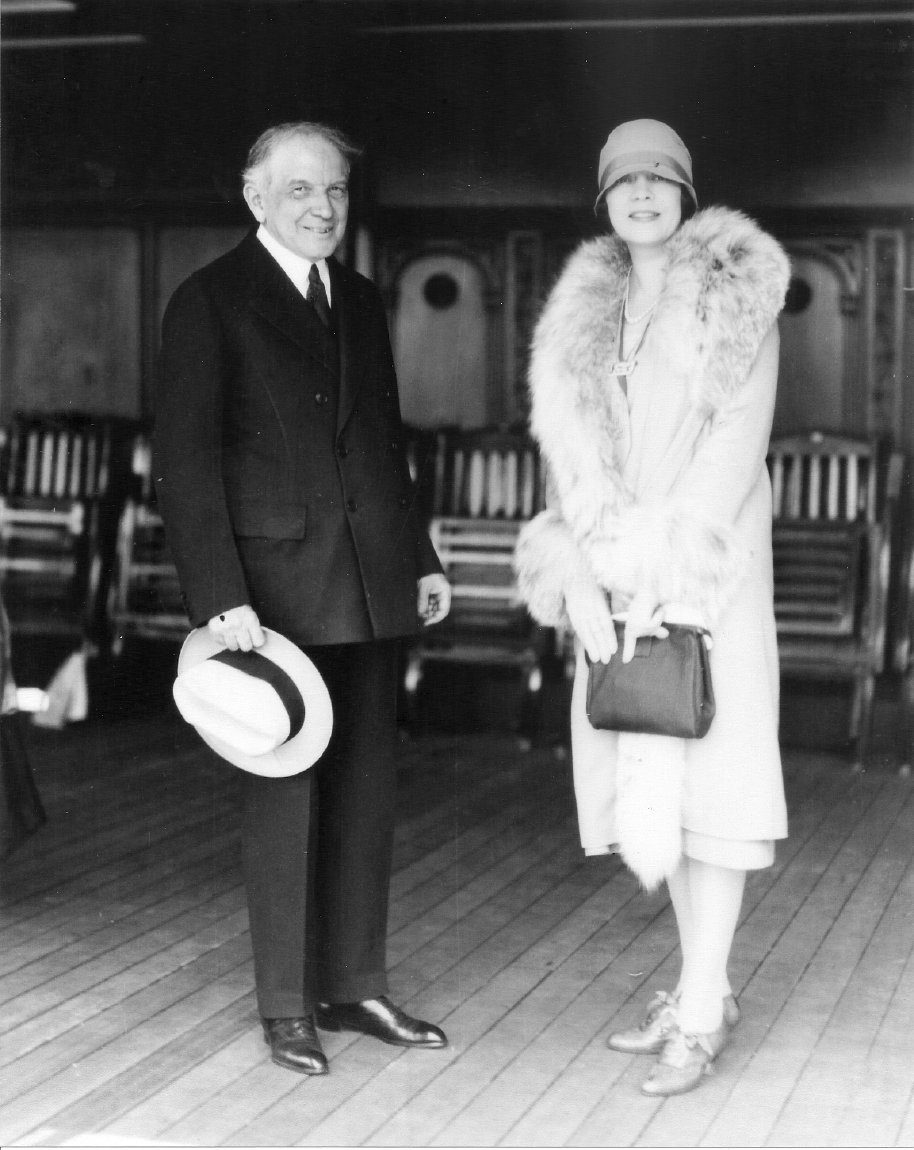 William Crapo Durant and Catherine Lederer Durant on the decks of probably White Star Line, RMS Majestic ship taken prior to sailing from New York harbor for Europe around 1926. Notice deck chairs in the background. Probably an publicity photograph of Durant Motors, New York, New York.