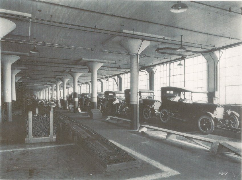 Durant Motors Inc. Lansing, Michigan Plant assembly line photograph taken from a distance. Appears to be a row of 1923 Star Touring cars coming off the line.
