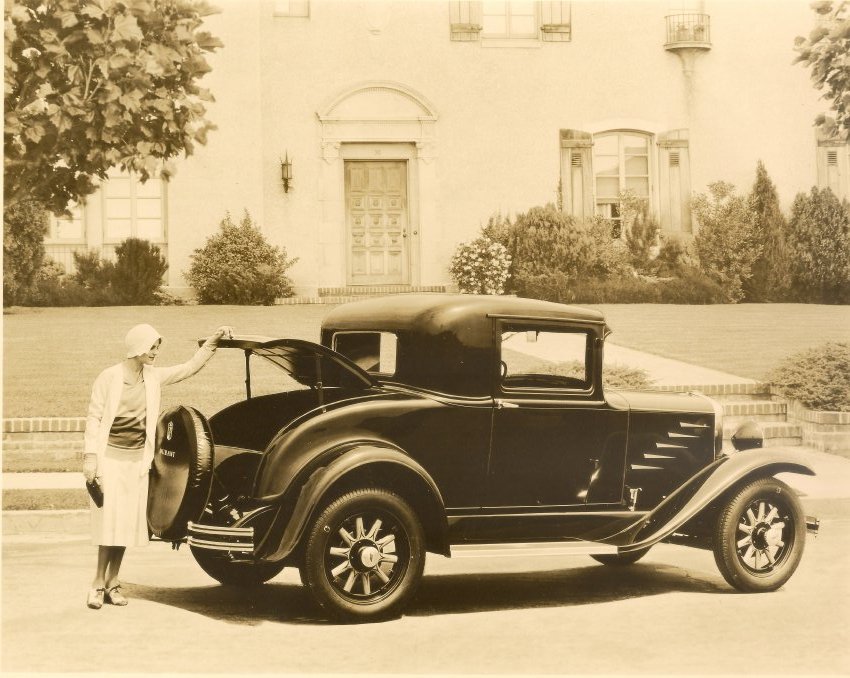 1930 Durant Model 614 Business Coupe with unidentified woman in front of uknown house. Possibly a California factory advertising photograph.