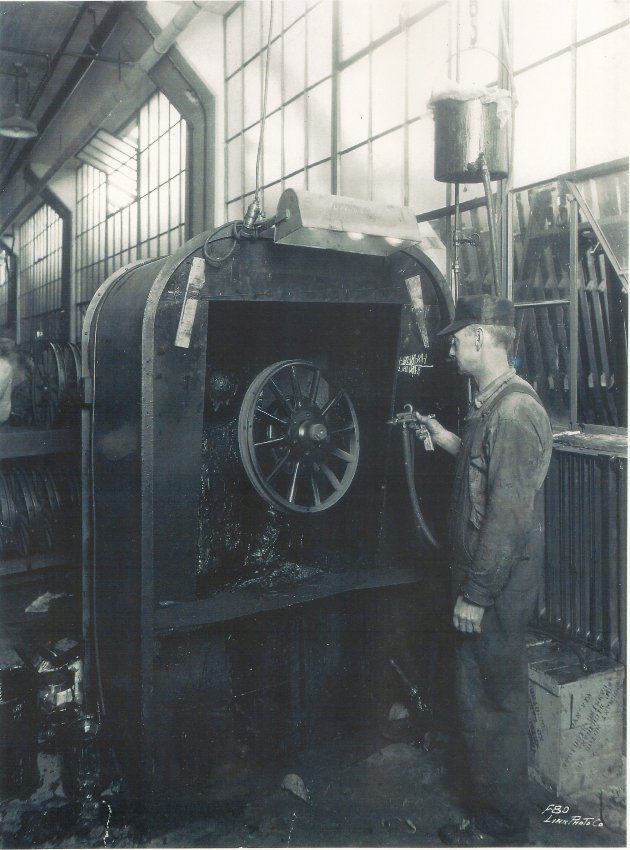 Durant Motors Inc. Lansing, Michigan wheel paint booth. Here the assembled wooden spoke wheels are painted. The wheel pictured appears to be a Star automobile wheel. Notice the marks on the front of the paint booth indicating the number of pieces the painter has painted. Early assembly line workers were payed by the piece not by the hour on some projects.