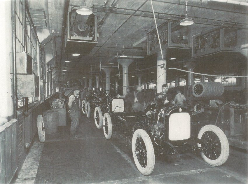 Durant Motors Inc. Lansing, Michigan Plant vehicle assembly line. A Durant Model A-22 automobile frame moves down the assembly line awaiting the addition of a body. Note the white rubber tires on the vehicle.