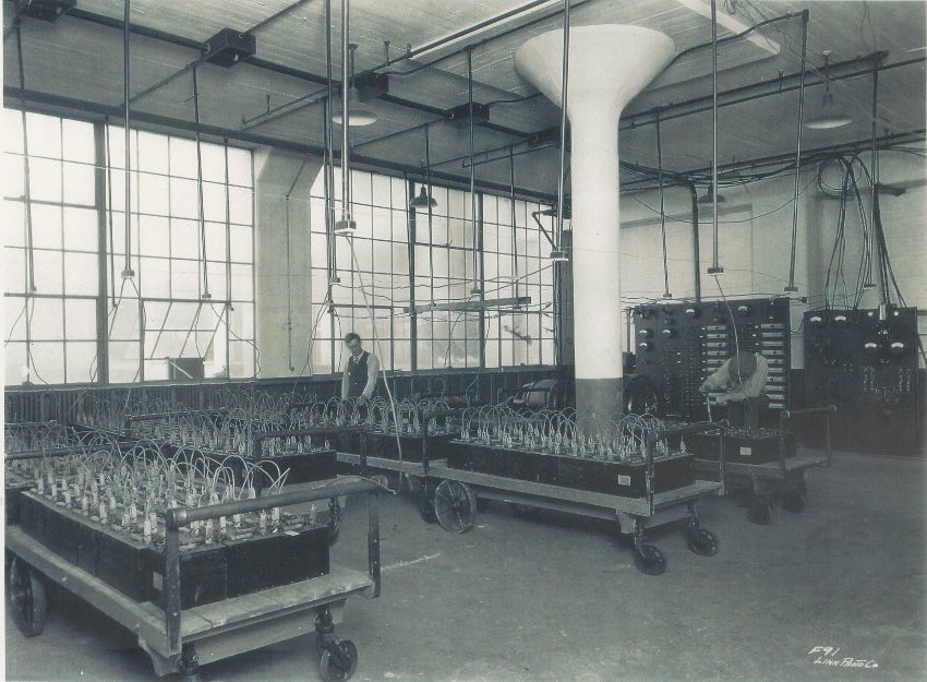 Durant Motors Inc. Lansing, Michigan Plant battery preparation room. Here batteries for cars are prepared by adding acid, and being charged with electricity. From here they will be moved to the assembly line for placing into the frames of cars.
