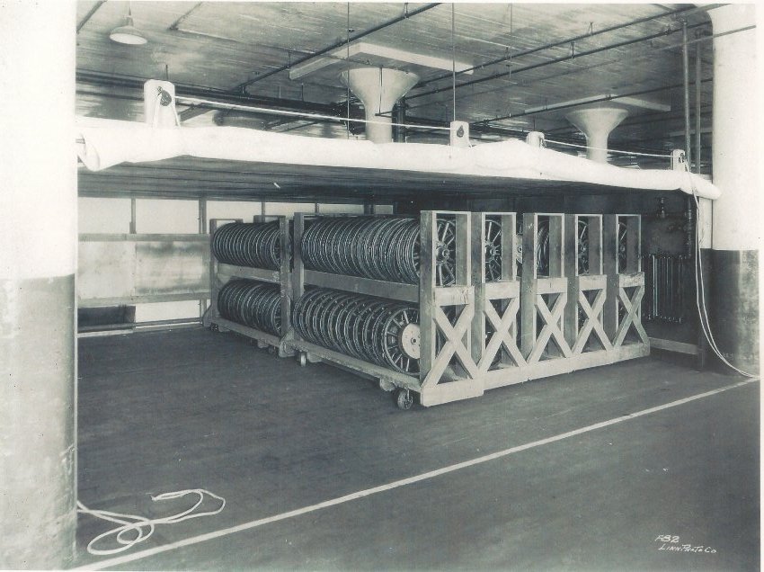 Durant Motors Inc. Lansing, Michigan finished wheel storage bins. Here wheels are stored in racks awaiting transport to the wheel assembly point on the assembly line where the wheel is attached to the chassis.
