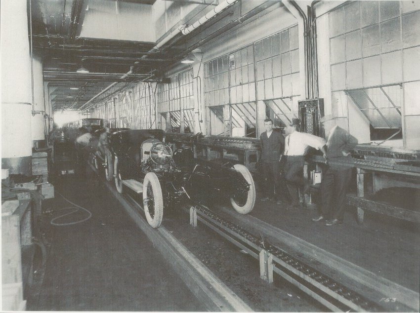 Durant Motors Inc. Lansing, Michigan plant vehicle assembly line. Here finished frame with parts moves down the assembly line to the next assembly point. Notice assembly line construction and white rubber tires on vehicle. Appears to be a Durant Model A-22 chassis.
