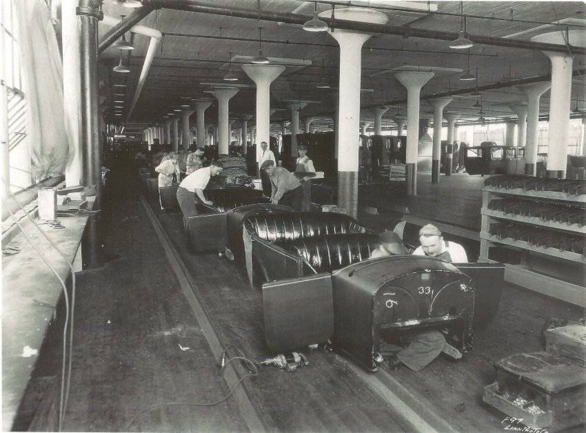 Durant Motors Inc., Lansing, Michigan Plant body preparation station on the assembly line. Here workers install doors, and other items in the body of the vehicles prior to the marriage of the body to the frame. This is a touring car body.