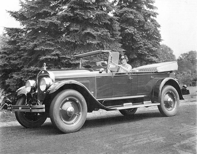 Promotional photograph of Miss Nebraska 1925, believed to be Miss Myrtle Roach, driving a Flint Model 55 touring automobile.