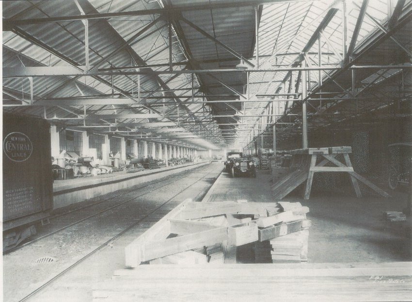 Durant Motors Inc. Lansing, Michigan Assembly Plant loading dock area. Touring cars await loading into railroad cars. Windshield frames are removed from the vehicle prior to shipment to allow for stacking of the vehicle in the railroad box cars. A New York Central railroad box car is visible on the right side of the photograph