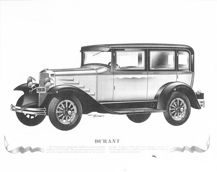 Dealership poster for display of the 1930 Durant Model 614 sedan. Print would be provided to dealers to hang up in their showrooms. The Durant Model 614 could be purchased in several different styles. Coach, Coupe, Roadster, Sedan and Touring. Cars could be purchased with vertical or with highly identifiable horizontal spears.