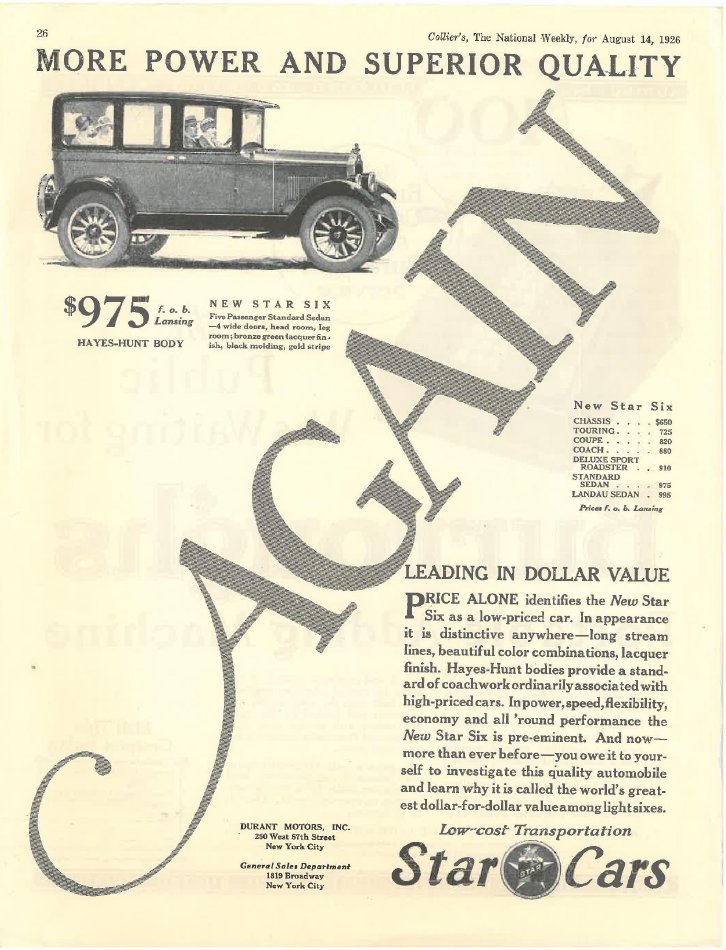 Star Six Five Passenger Sedan advertisement, Durant Motors Incorporated, 250 West 57th Street, New York, New York. Published August 14, 1926 in Collier's The National Weekly Magazine. The New Star Six five passenger sedan priced at $975.00. Collier's was an American magazine, founded in 1888 by Peter Fenelon Collier, which went by the title Collier's Weekly during its early years but by 1914 the name was changed to Collier's The National Weekly Magazine and was published out of Springfield, Ohio.