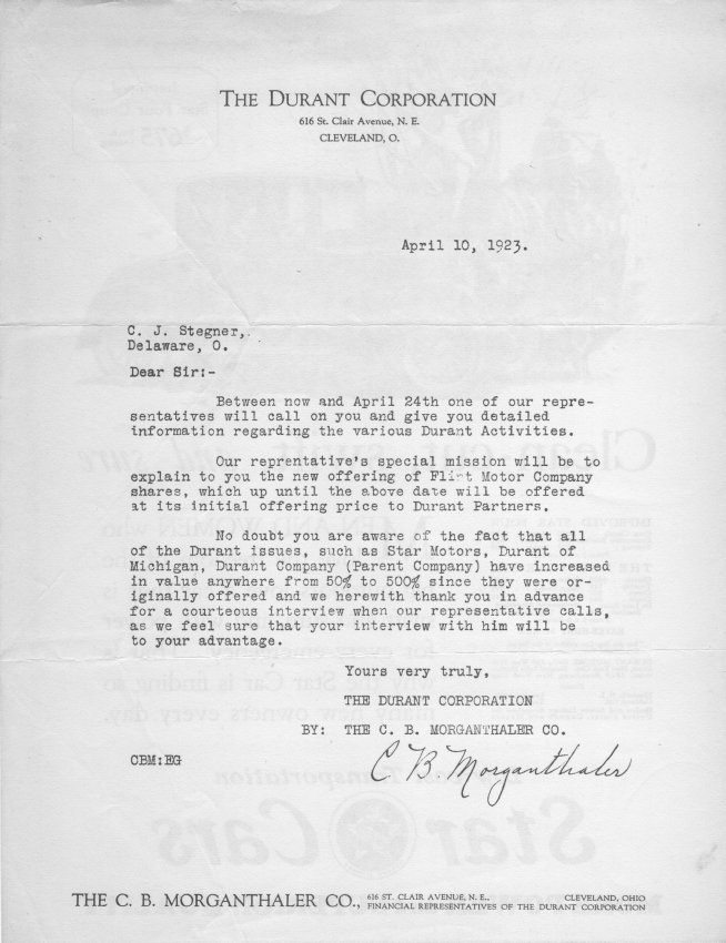 Letter from the Durant Corporation, 616 St. Clair Street, Cleveland, Ohio addressed to C.J. Stegner, Delaware, Ohio providing information on investing in stock of the Flint Motors Corporation. Letter was written by C. B. Morganthaler of the C.B. Morganthaler Corporation for the Durant Motors Corporation.