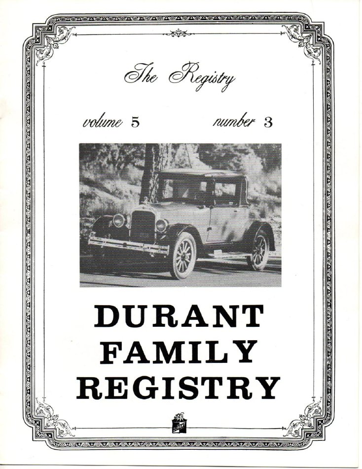 The Registry, Volume 5 Number 3, November 1980. The Registry was published from 1976 to 1998 by the Durant Family Registry under Editor Jeffrey Gillis. Published quarterly to members of the Durant Family Registry the club magazine proved invaluable to members researching and restoring Durant Motors automobiles. The Durant Family Registry would evolve into the Durant Motors Automobile Club after 1998.
