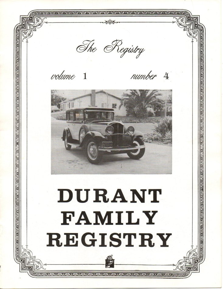 The Registry, Volume 1 Number 4, February 1977. The Registry was published from 1976 to 1998 by the Durant Family Registry under Editor Jeffrey Gillis. Published quarterly to members of the Durant Family Registry the club magazine proved invaluable to members researching and restoring Durant Motors automobiles. The Durant Family Registry would evolve into the Durant Motors Automobile Club after 1998.